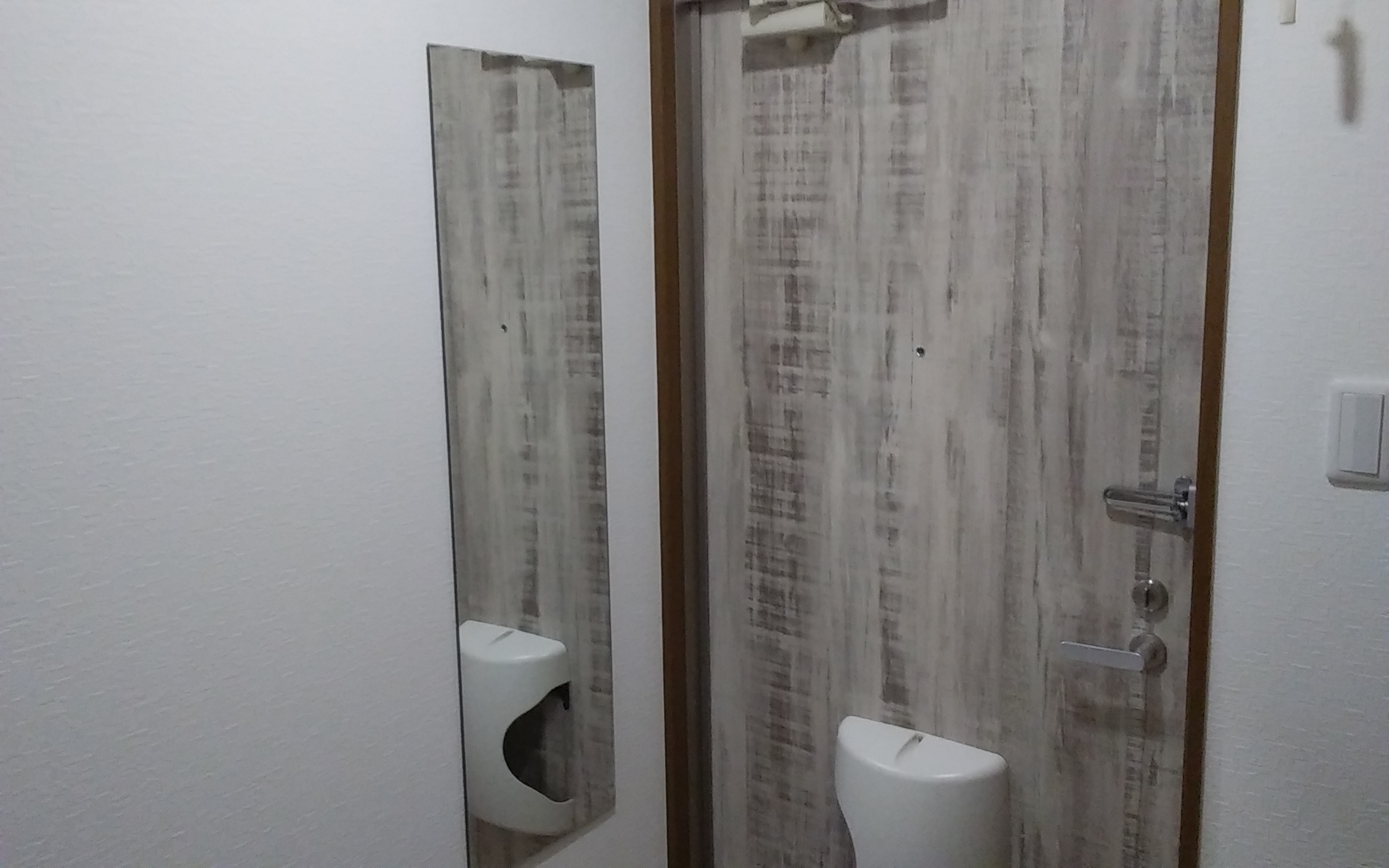 入り口ドア脇には姿見鏡を設置、ドア内側もオシャレな模様です。